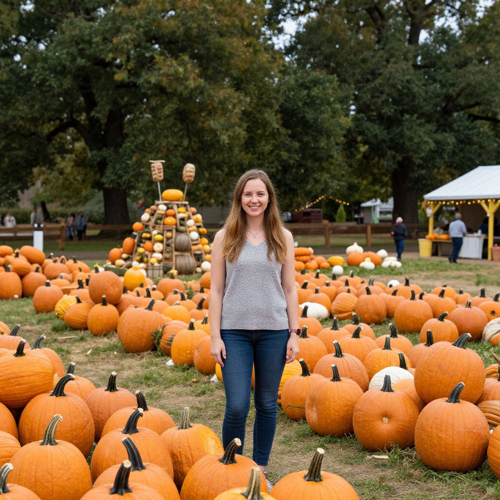 Woman standing amidst a vibrant sea of orange pumpkins at Green Bluff Becks Harvest House Pumpkin Patch, surrounded by lush green trees and a festive outdoor setting.
