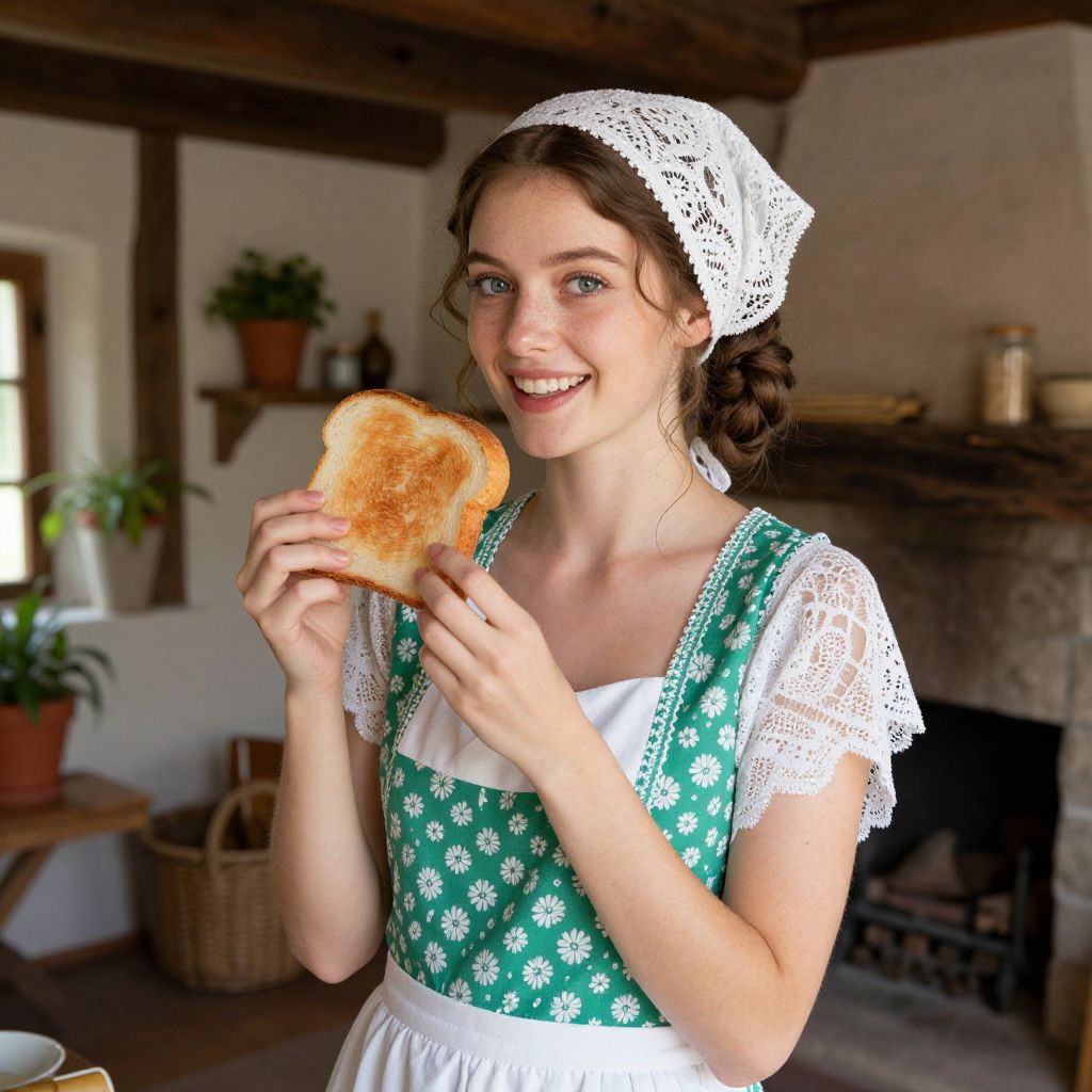 Photograph of a young woman with fair skin and brown hair in a braided bun, wearing a white lace cap, green floral dress with white lace sleeves, and white apron. She's holding a slice of toasted bread and smiling. The background shows a rustic, wooden-beamed room with potted plants, a stone fireplace, and various kitchen items. The lighting is natural, highlighting her cheerful expression.