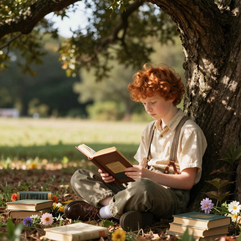 Photograph of a young boy with curly red hair, fair skin, and freckles, sitting cross-legged on the ground under a large tree. He's wearing a white short-sleeved shirt, grey suspenders, and brown pants, reading a book. Surrounding him are several stacked books, colorful flowers, and dappled sunlight filtering through the tree's leaves. The background shows a blurred, sunlit meadow. The scene evokes a peaceful, nostalgic atmosphere, with the boy's focused expression and the natural, serene setting.