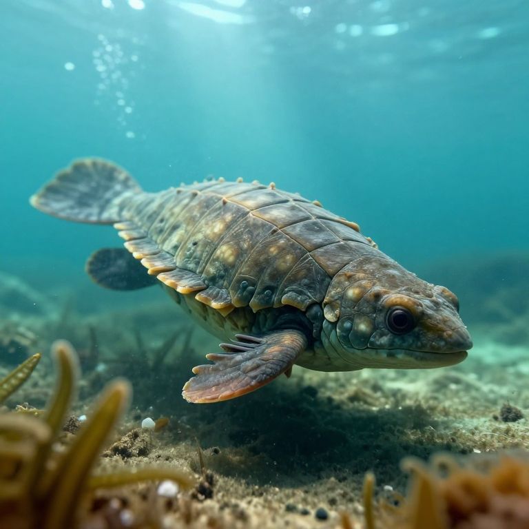 An artistic reconstruction of Sacabambaspis swimming through a prehistoric ocean, featuring soft light filtering through the water, detailed texture on its armored plates, surrounded by soft sediment and early marine plants, emphasizing its unique evolutionary features in a natural environment.
