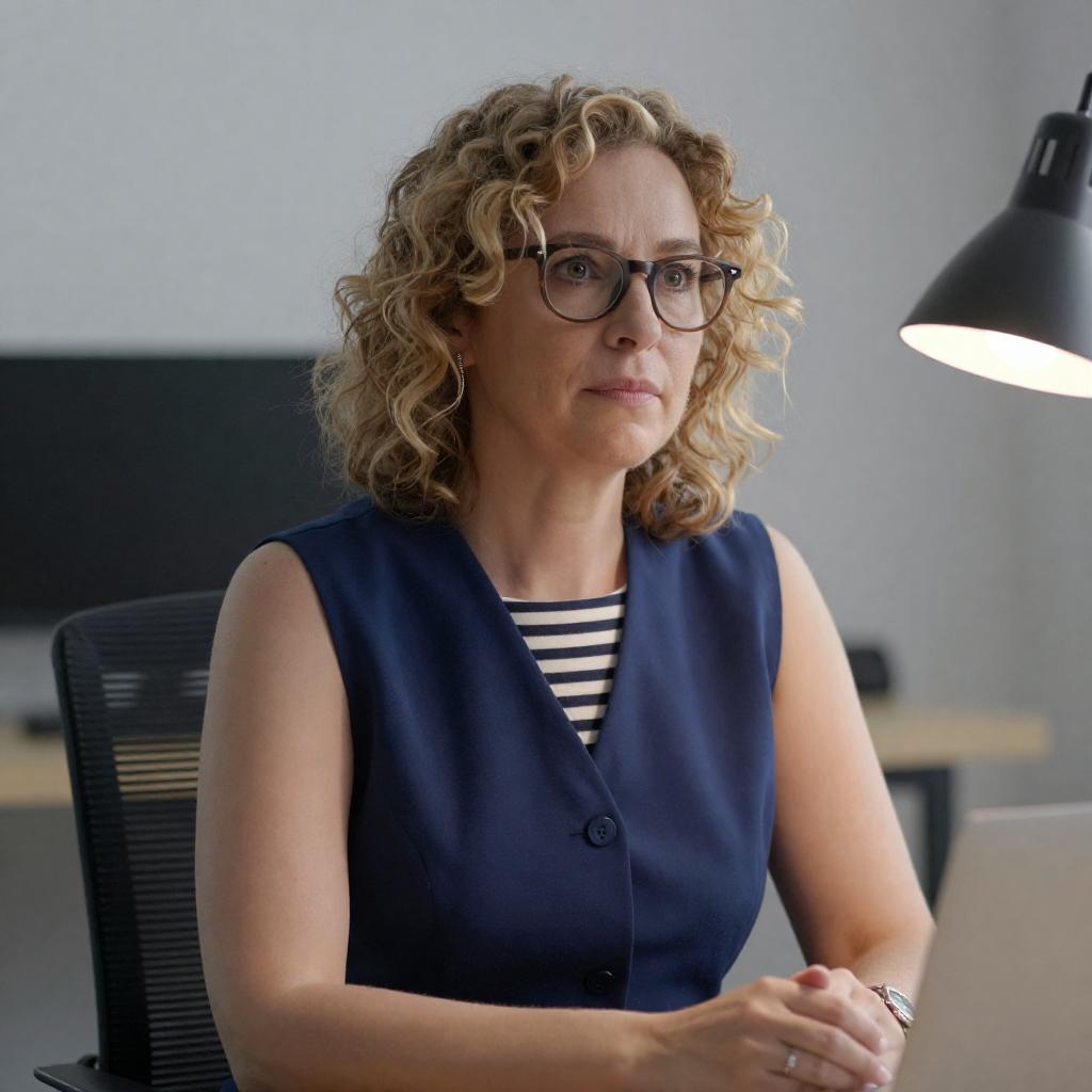 Photograph of a middle-aged woman with curly blonde hair and glasses, wearing a blue sleeveless vest over a striped shirt. She is seated at a desk, looking slightly to the right with a neutral expression. A desk lamp is on the right, and a blurred background suggests an indoor office setting.