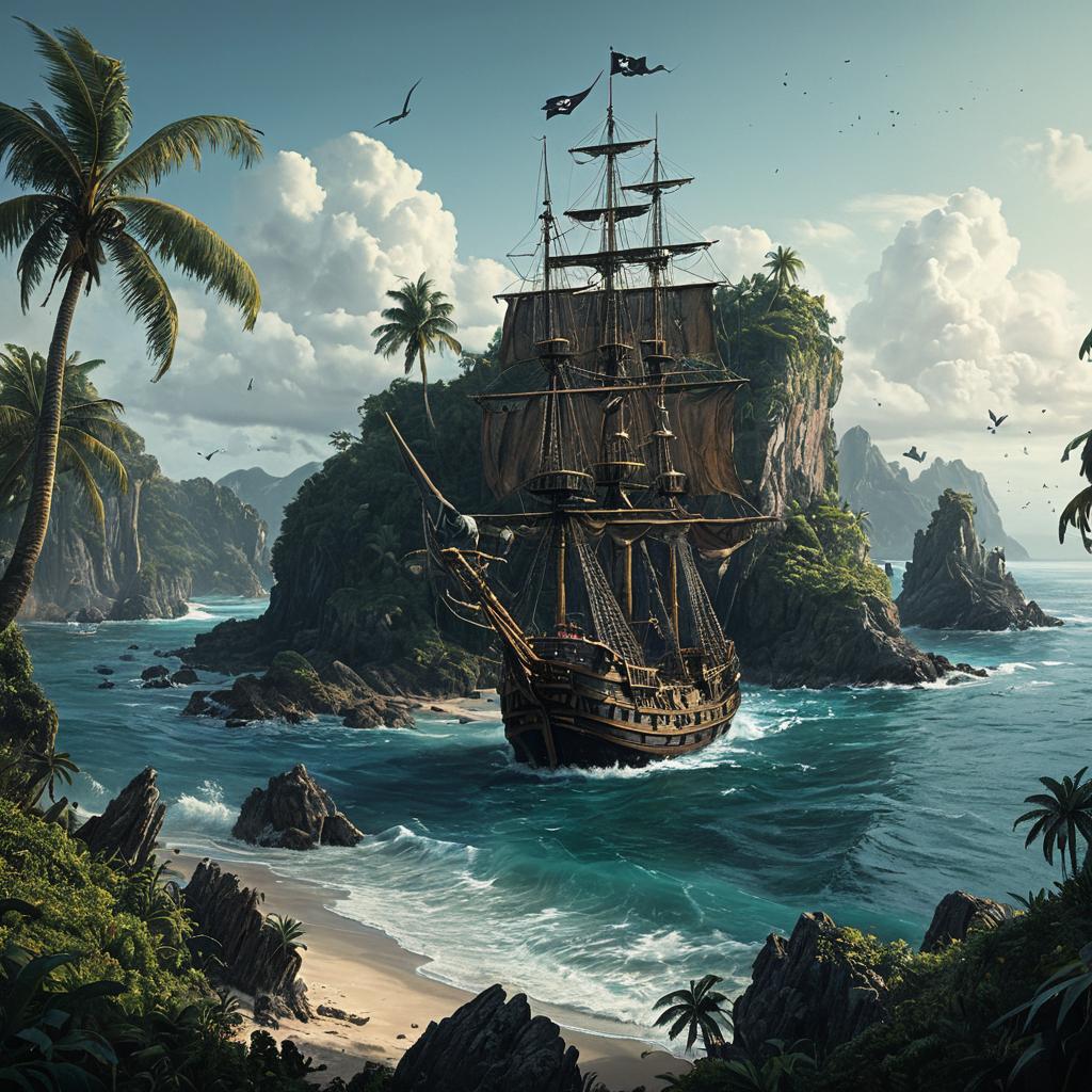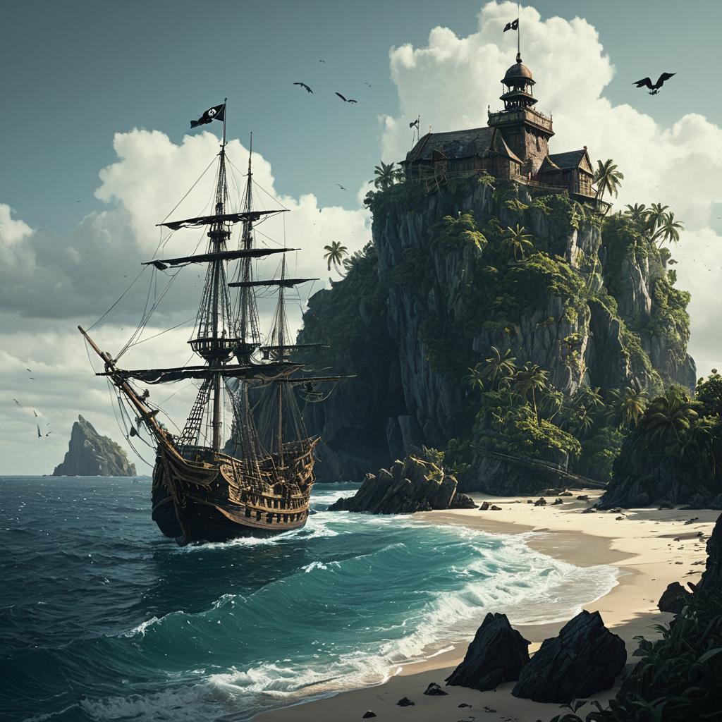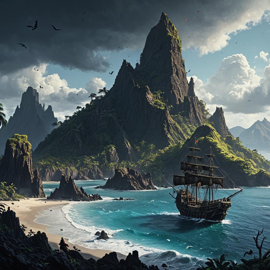 A detailed matte painting of a volcanic island with steep, jagged peaks covered in dense vegetation. The island is surrounded by a sandy beach and turquoise ocean waves. A classic pirate ship with dark sails is anchored nearby, set against a dramatic sky with clouds and soaring birds. The scene evokes fantasy art style inspired by Feng Zhu and CGSociety.