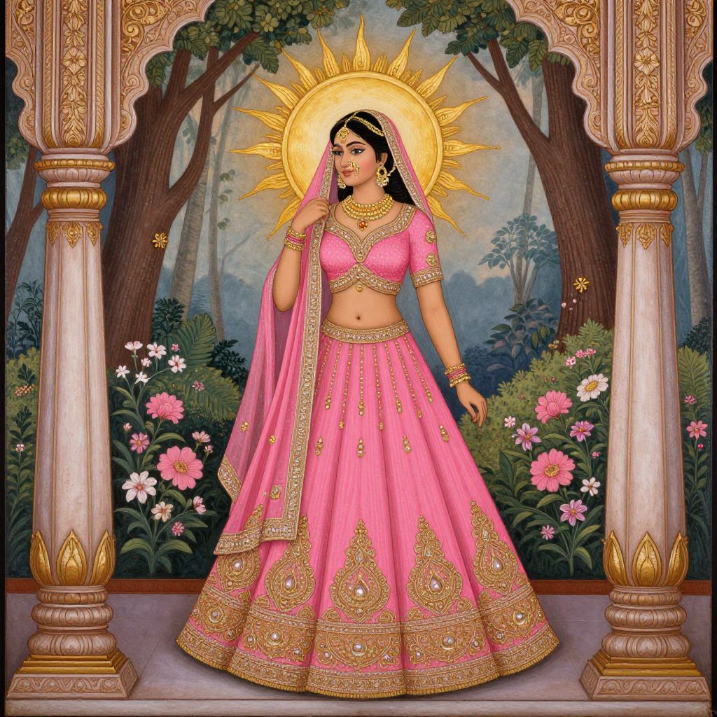 Digital illustration of an Indian woman in a pink, gold-embellished lehenga with veil, halo, and ornate jewelry, standing in a
