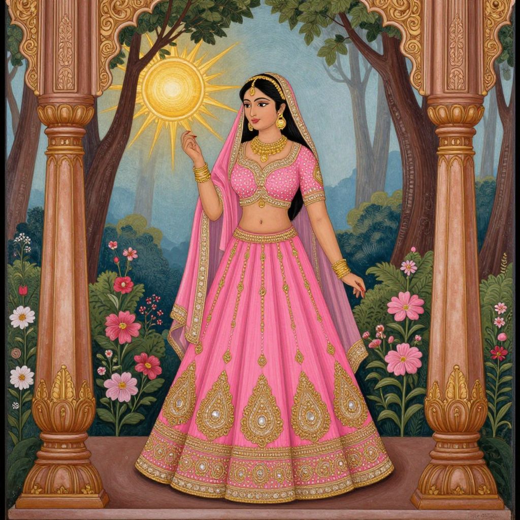 Elegant Indian miniature painting depicts a woman in a vibrant pink lehenga adorned with intricate gold embellishments, standing gracefully between two ornate pillars against a serene forest backdrop with blooming flowers and a golden sun motif.