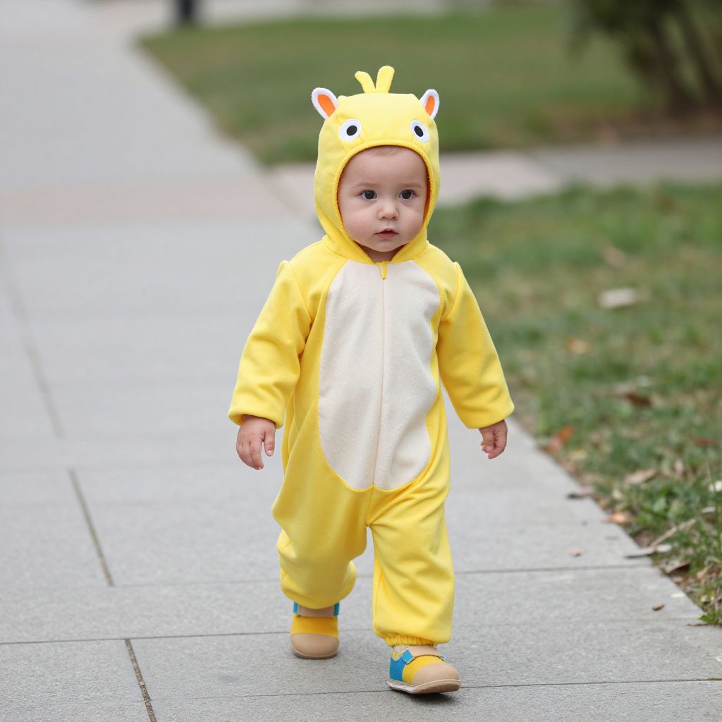 Infant Buzz Costume, in a costume walking down a sidewalk with a ball