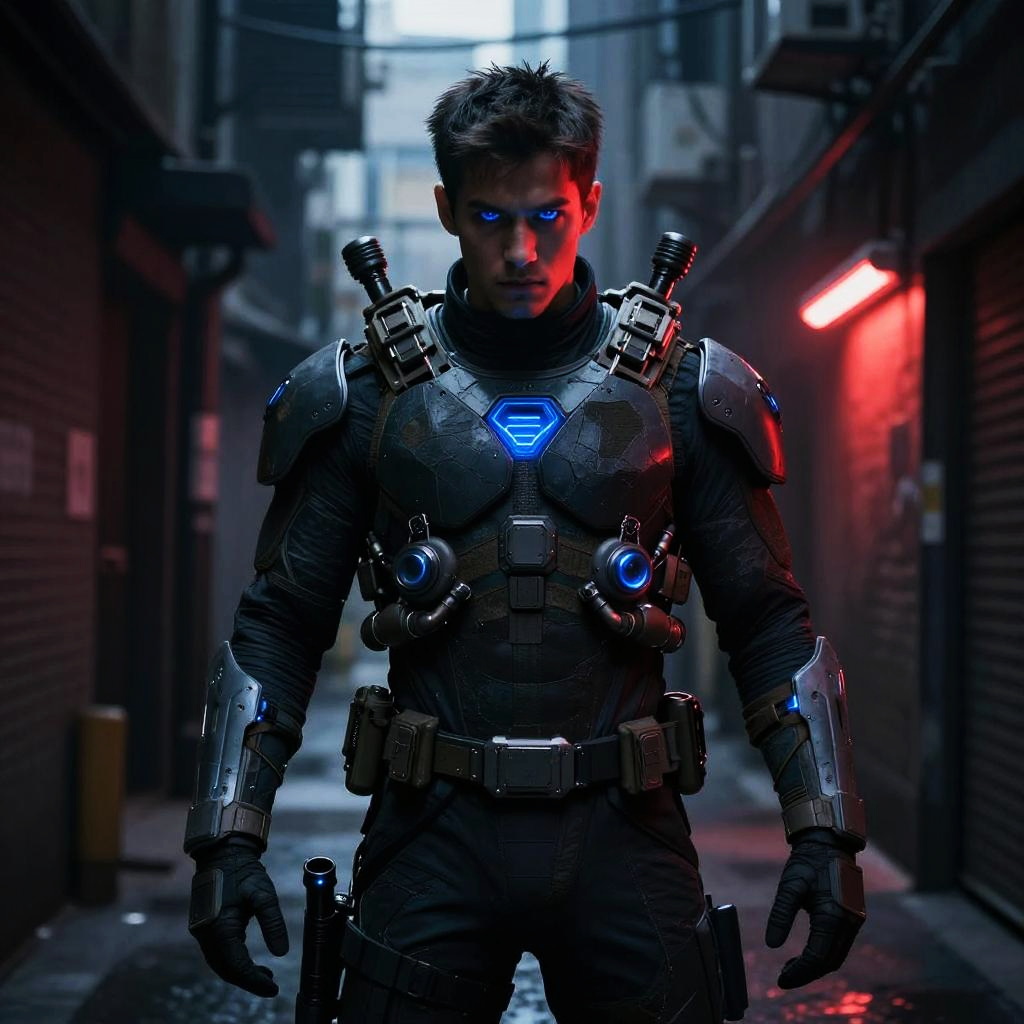 Turn into a superhero emerging from the shadows in a dark alley, illuminated by glowing blue and red neon lights, wearing tactical armor with high-tech gadgets, intense gaze ready for action, cyberpunk aesthetic with moody and gritty ambiance.