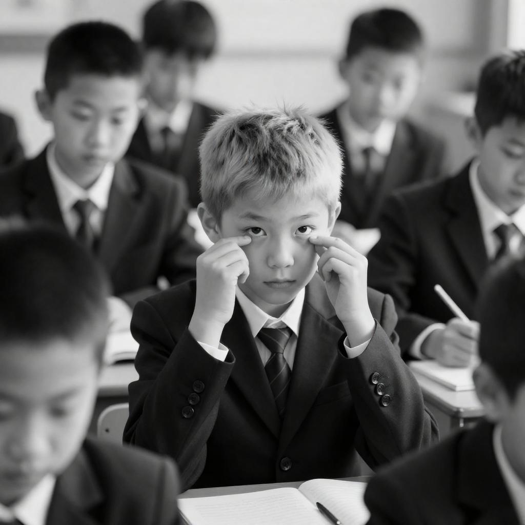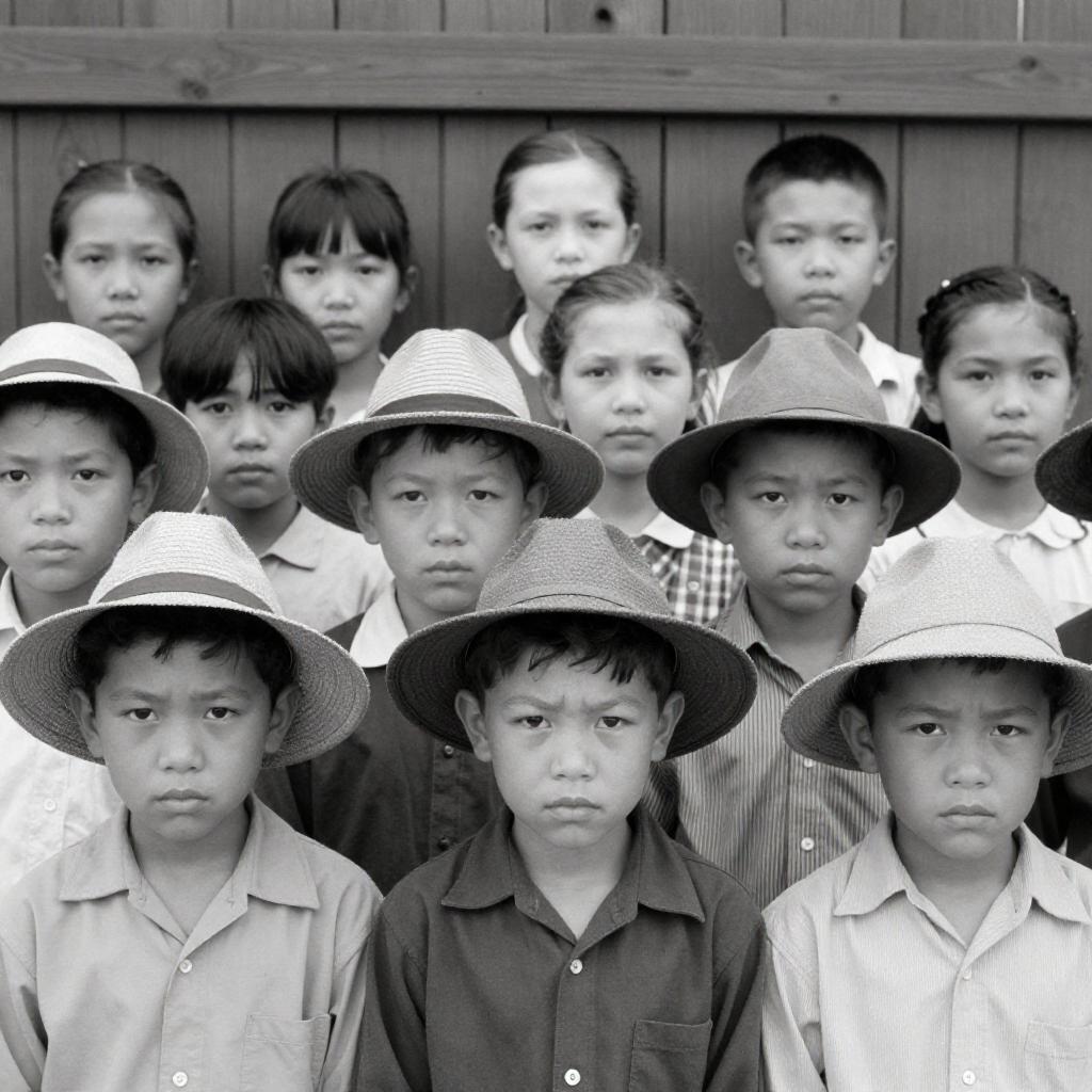 Black-and-white photograph of a group of children in front of a wooden fence. Foreground children, mostly boys, wear hats and collared shirts. Intense expressions. Background children, mostly girls, with various hairstyles. Wooden fence with horizontal planks in background. 12 children total.
