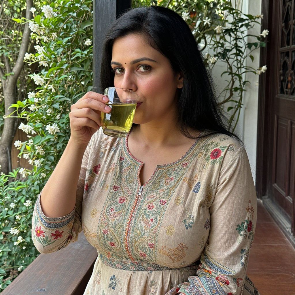 Photograph of a South Asian woman with long black hair, wearing an embroidered beige blouse, drinking green tea outdoors, surrounded by lush greenery and a