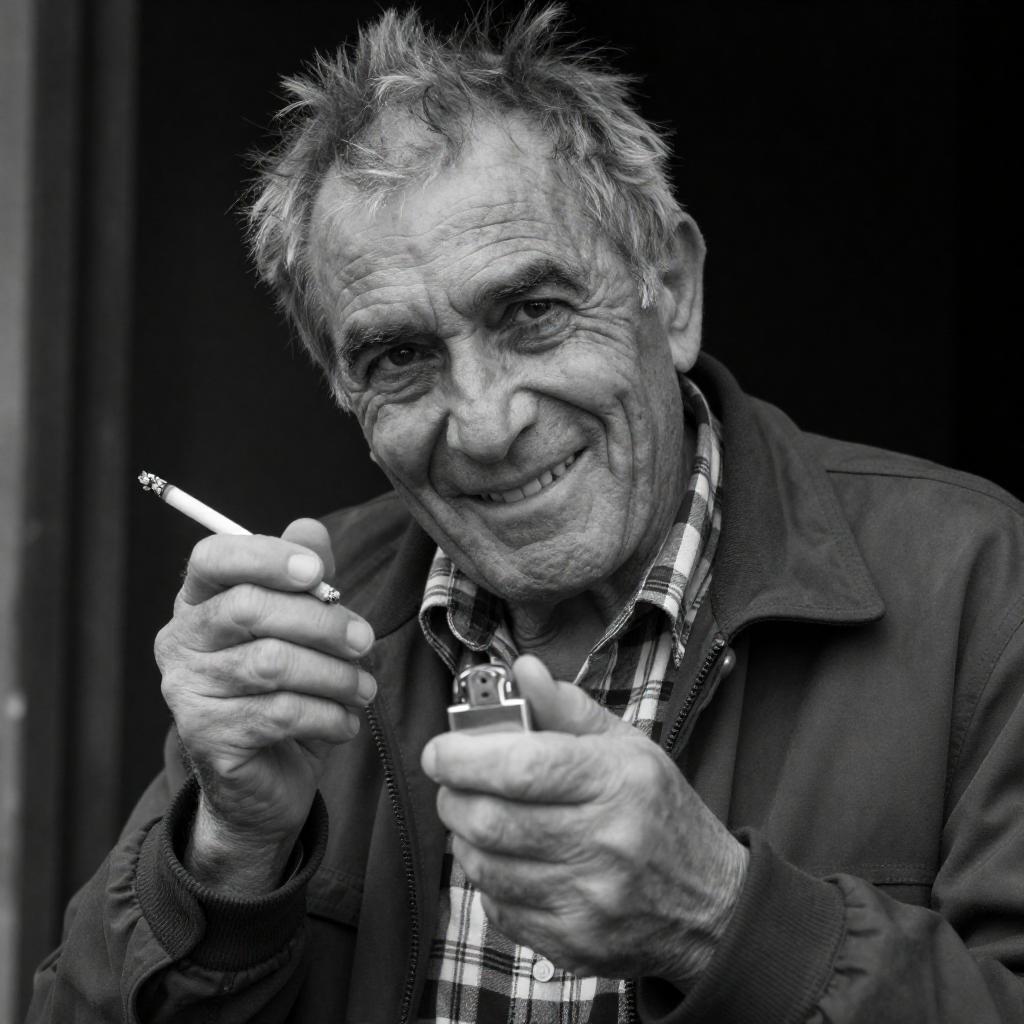 Black-and-white photograph of an older man with disheveled hair, plaid shirt, and dark jacket, holding a cigarette in his right hand and a lighter in his left. He has a wide, intense grin. Dark background. One person.