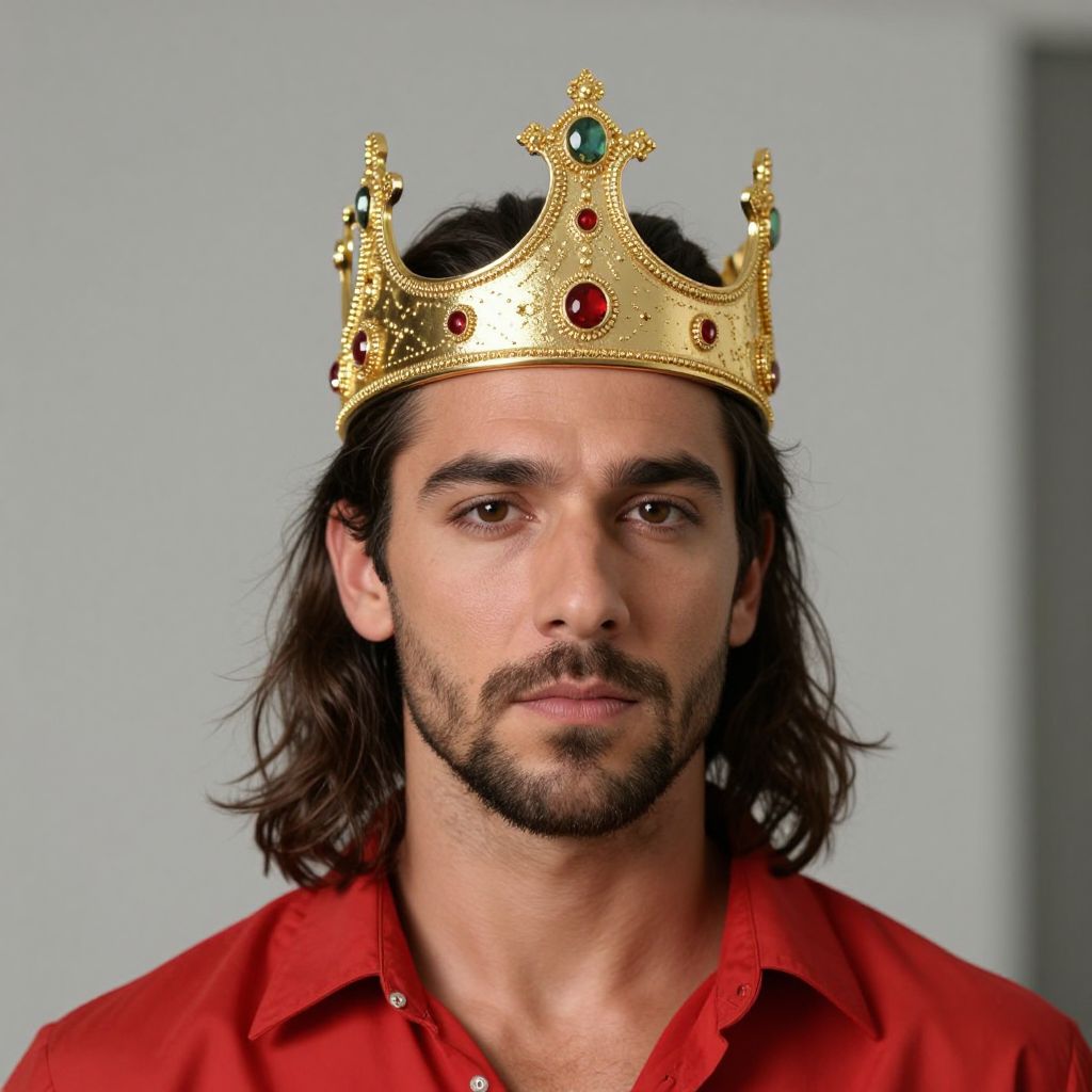 Iron Sheik Costume, a close up of a man wearing a crown and a red shirt