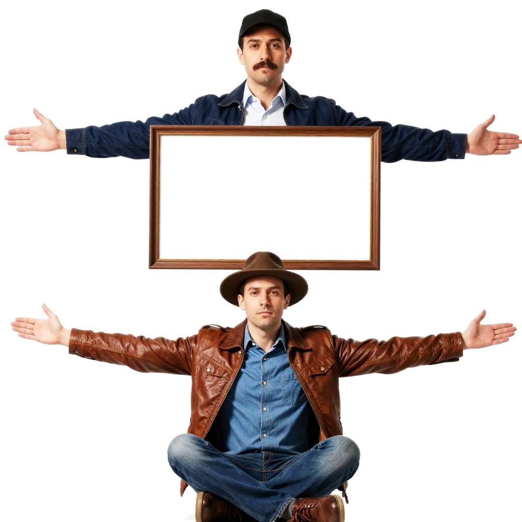 Two men posing against a white background. The top man stands wearing a black cap, mustache, blue jacket, and white shirt, holding an empty wooden frame with outstretched arms. The bottom man sits cross-legged wearing a brown leather jacket, blue shirt, brown fedora hat, jeans, and brown shoes, with arms outstretched and a focused expression.