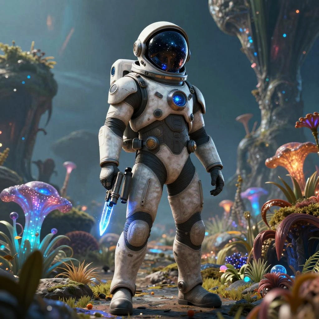 Ezzio depicted as a space explorer on an alien planet, strange flora and bioluminescent landscape, futuristic suit with helmets reflecting stars, holding an energy weapon, cinematic wide shot, sci-fi digital illustration with vibrant colors.