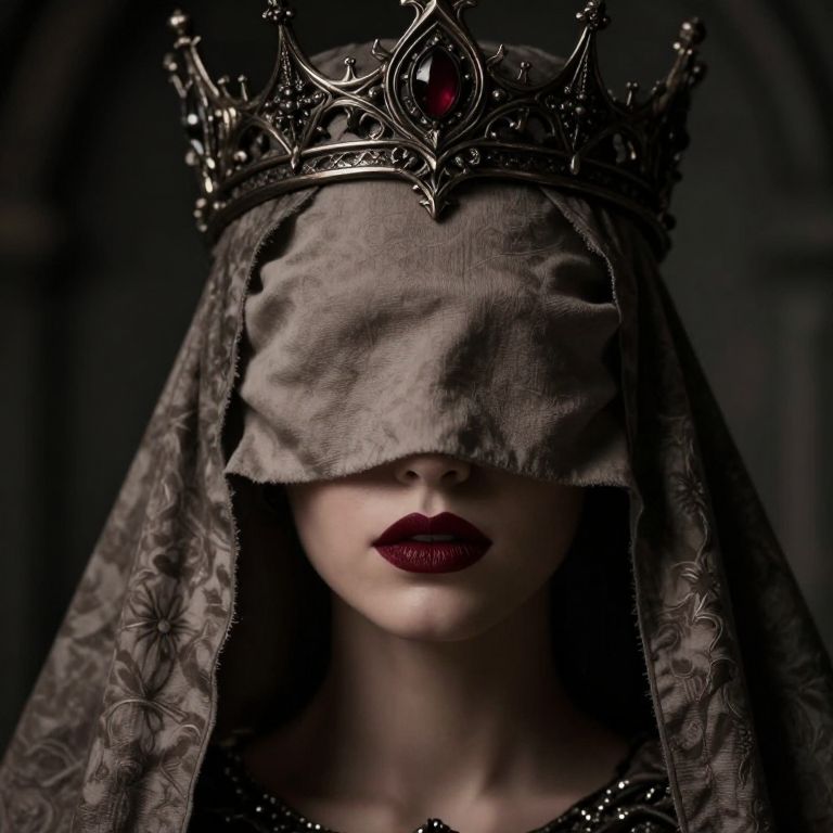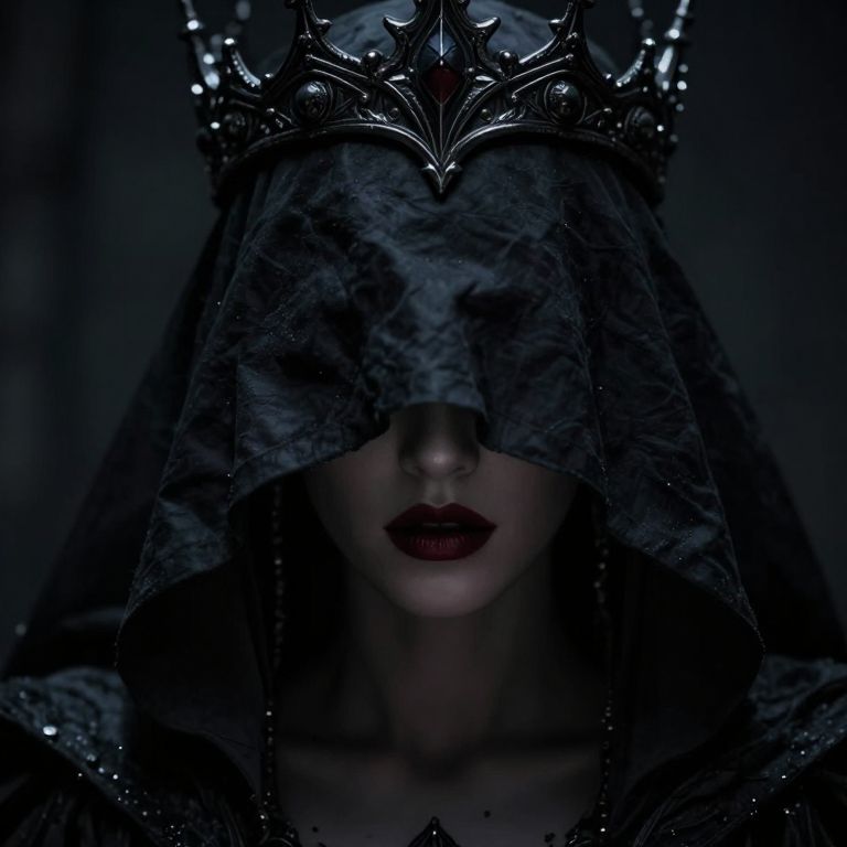 Dark atmosphere, dark gray filter close up view Dark Queen, gorgeous lips, dark red lipstick, in a dark robe with her face completely hidden under a heavy fabric, the eyes and the floor of the face are covered with a cloth On the head rises a luxurious crown with exquisite details, Gothic crown of the night queen, The crown is tightly worn on the head The atmosphere is dark and mystical, accentuated by dramatic lighting and deep shadows highdetailed, captured in high detail