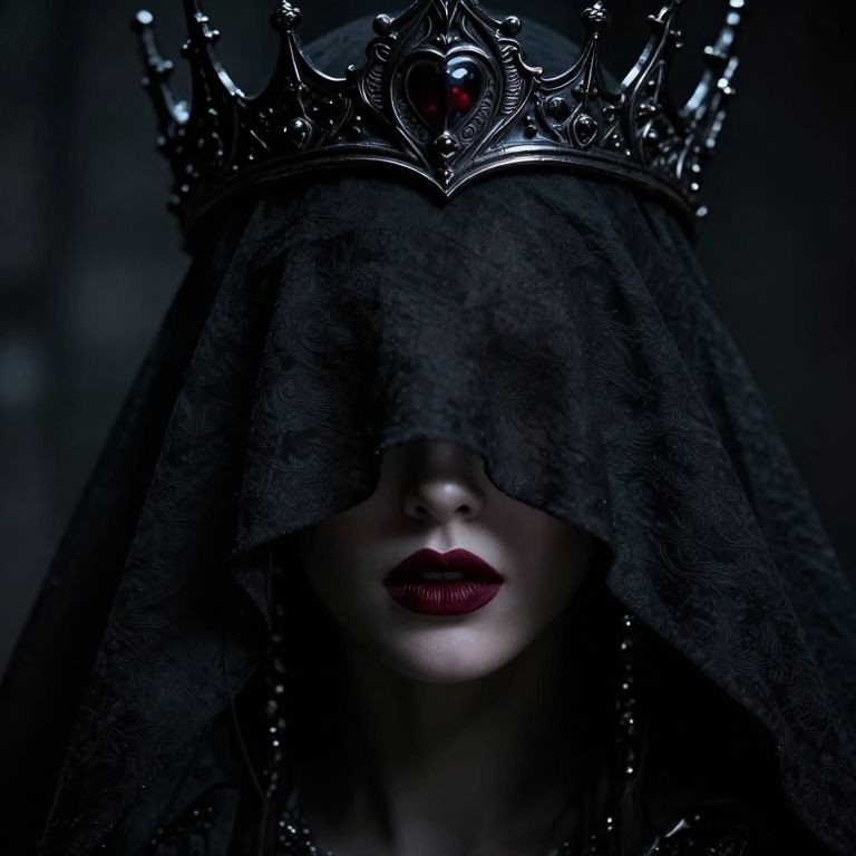 A dark, moody photograph of a woman with pale skin and full, red lips. She wears a black, lace veil that obscures most of her face, leaving only her lips visible. On her head is an ornate, silver crown with a red gem in the center. The background is blurred, featuring dark, indistinct shapes. The overall color palette is dark and dramatic, with deep blacks and blues, creating a gothic, mysterious atmosphere. The woman's makeup is subtle except for her bold red lipstick. The veil has a textured, lace pattern, adding to the eerie, regal aesthetic.