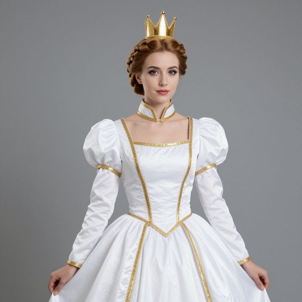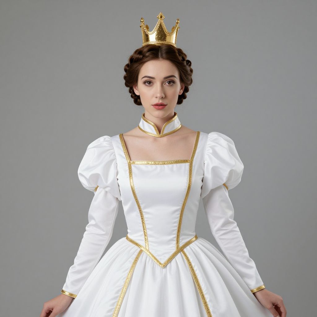 Photograph of a fair-skinned woman with brown hair in a white, puffed-sleeve princess dress, gold crown, and choker,