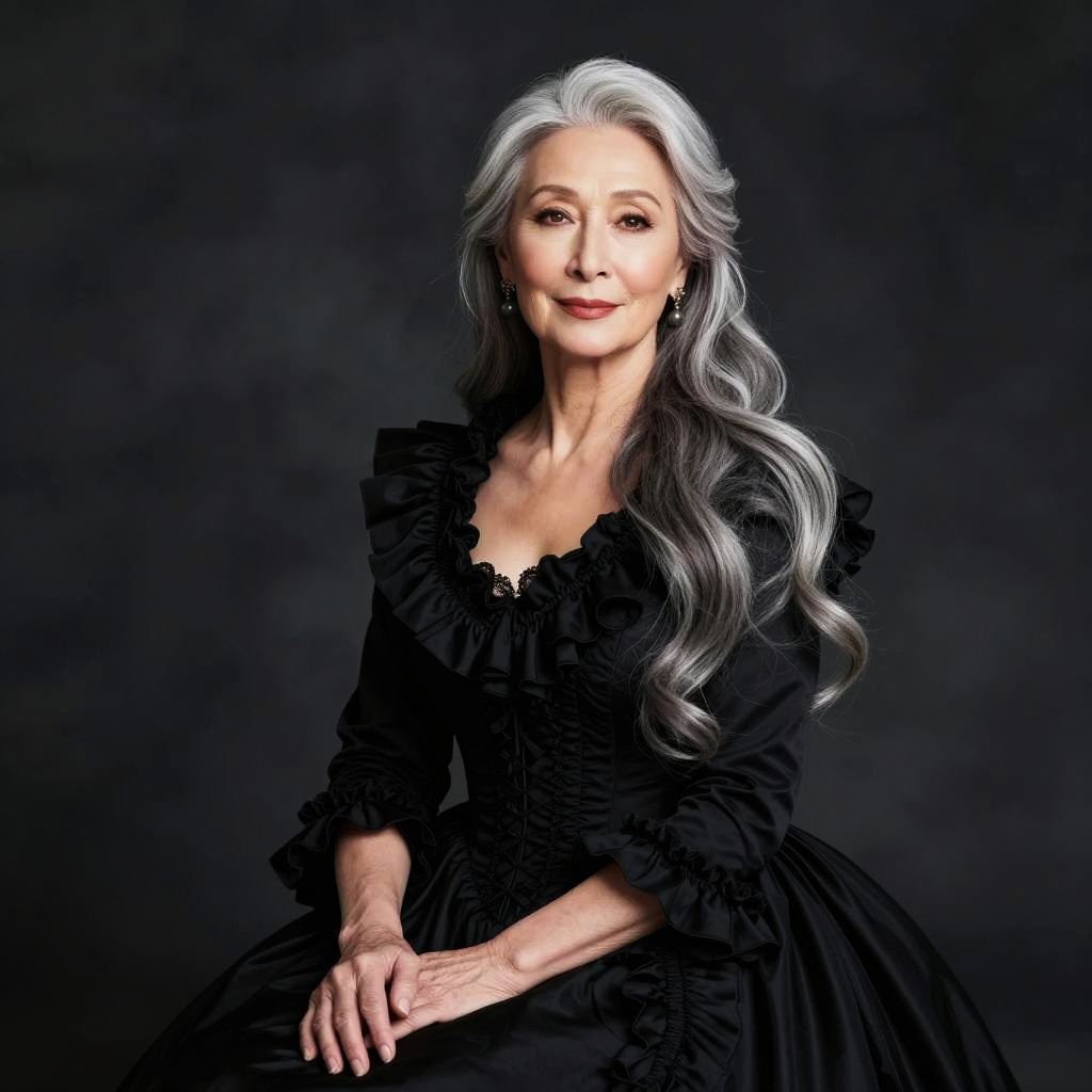A glamorous portrait of an elegant older woman with long, flowing silver hair, seated against a dark, textured backdrop. She wears a black, ruffled Victorian-inspired dress, exuding timeless sophistication and grace in a classic fine art photography style.