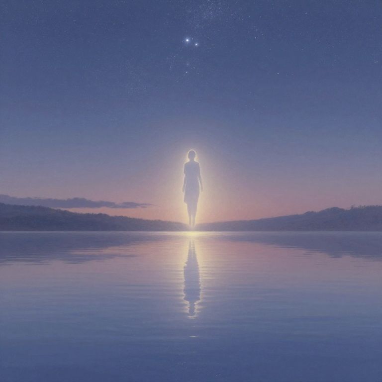 Astrally projected spirit hovering above calm reflective water at twilight, mirror-like water mirroring the sparkling starry sky, soft dreamlike glow enveloping the scene, tranquil and magical mood, delicate brushwork and atmospheric lighting