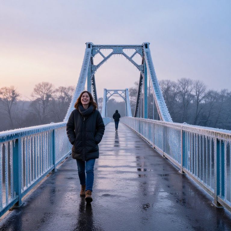 An iridescent bridge made of frozen laughter connects two moments in time—one rainy afternoon and one impossible dawn—defying all conventional geography.