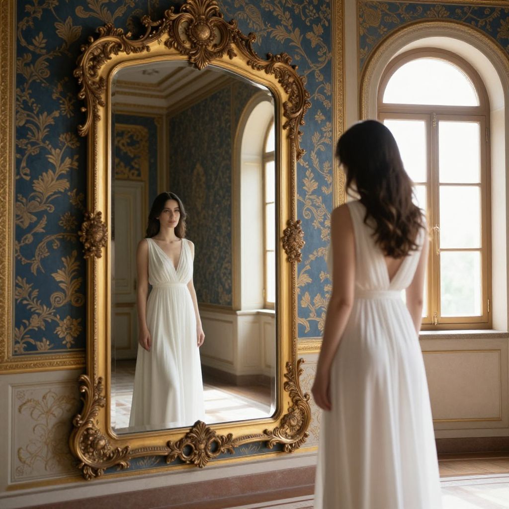 Photograph of a woman with long dark hair, wearing a sleeveless, white, flowing gown, standing in front of an ornate, gold-framed mirror. The mirror reflects her face and upper body. The room has blue, gold-patterned wallpaper, arched windows, and white wainscoting. Sunlight streams through the windows, illuminating the scene. The woman gazes at her reflection with a thoughtful expression, creating a serene, elegant atmosphere. The floor is polished wood, adding to the luxurious setting.