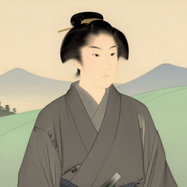 Digital illustration of a serious East Asian woman in traditional black kimono with a topknot hairstyle, set against a green and blue mountainous background.