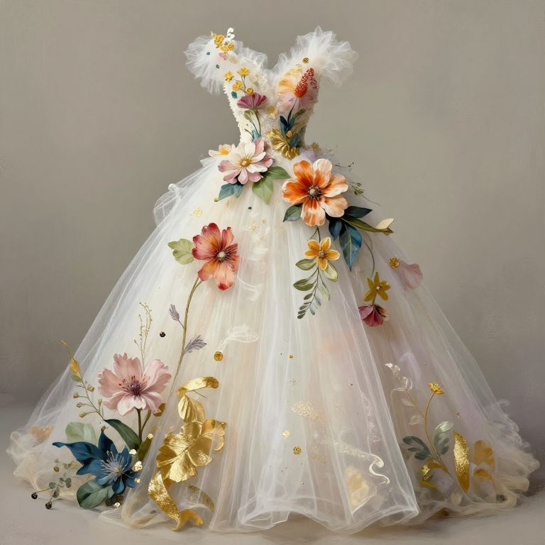Wedding dress art, surreal bridal dress blending organic elements like flowers and leaves into fabric, vibrant colors with soft gold accents, whimsical and romantic atmosphere, dreamy textures, mixed media style combining painting and digital art