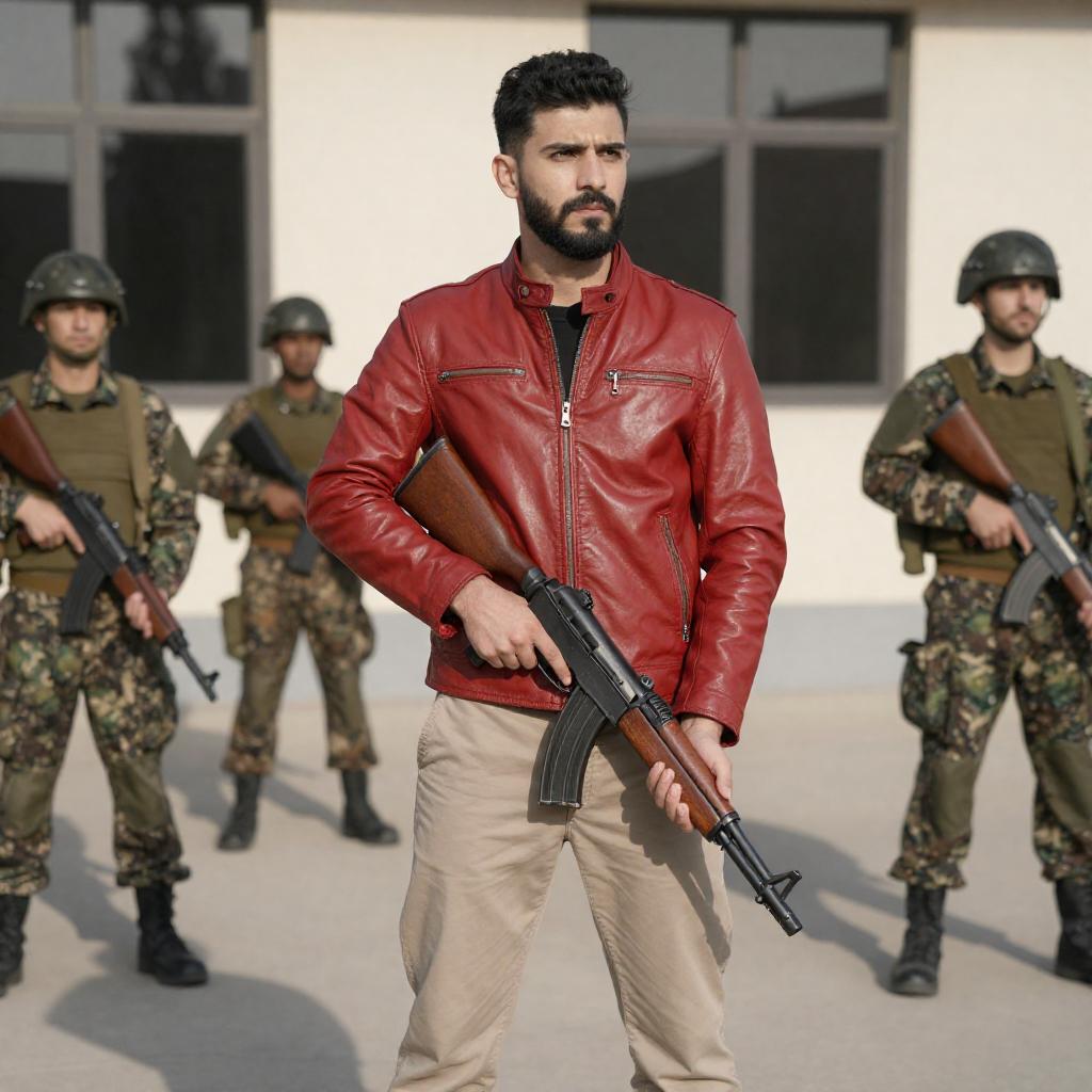 Portrait of a man with short black hair and beard wearing a bright red leather jacket and beige pants, holding a rifle. He stands confidently in front of a beige building with large windows. Three soldiers dressed in camouflage uniforms, helmets, and combat boots, each holding rifles, stand behind him in formation. The scene is lit by bright sunlight casting distinct shadows.
