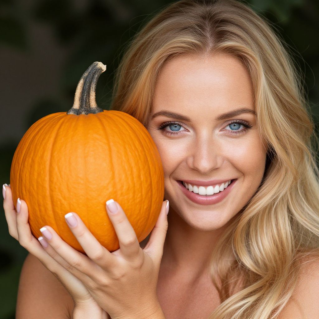 Blonde-haired woman smiling brightly while holding a vibrant orange pumpkin close to her face, showcasing her radiant blue eyes and manicured nails.