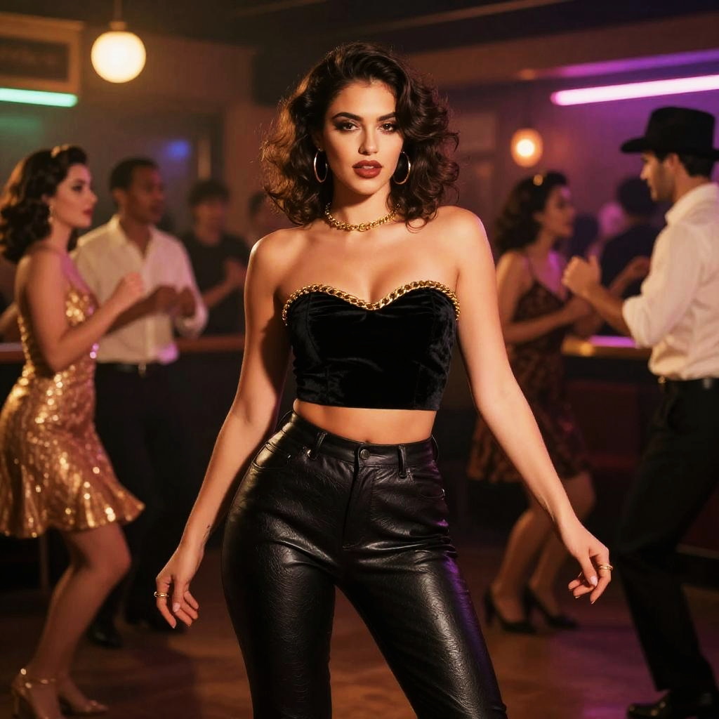 Photograph of a confident woman with wavy dark brown hair and fair skin, striding down a dimly lit nightclub dance floor. She wears a black velvet strapless crop top with a delicate lace trim and high-waisted black leather pants, accessorized with a gold choker necklace. Her makeup is dramatic with bold red lipstick. In the background, blurred figures of men and women in various outfits, including a woman in a gold sequin dress, dance under colorful neon lights. The atmosphere is lively, with warm and purple lighting creating a vibrant, energetic vibe.