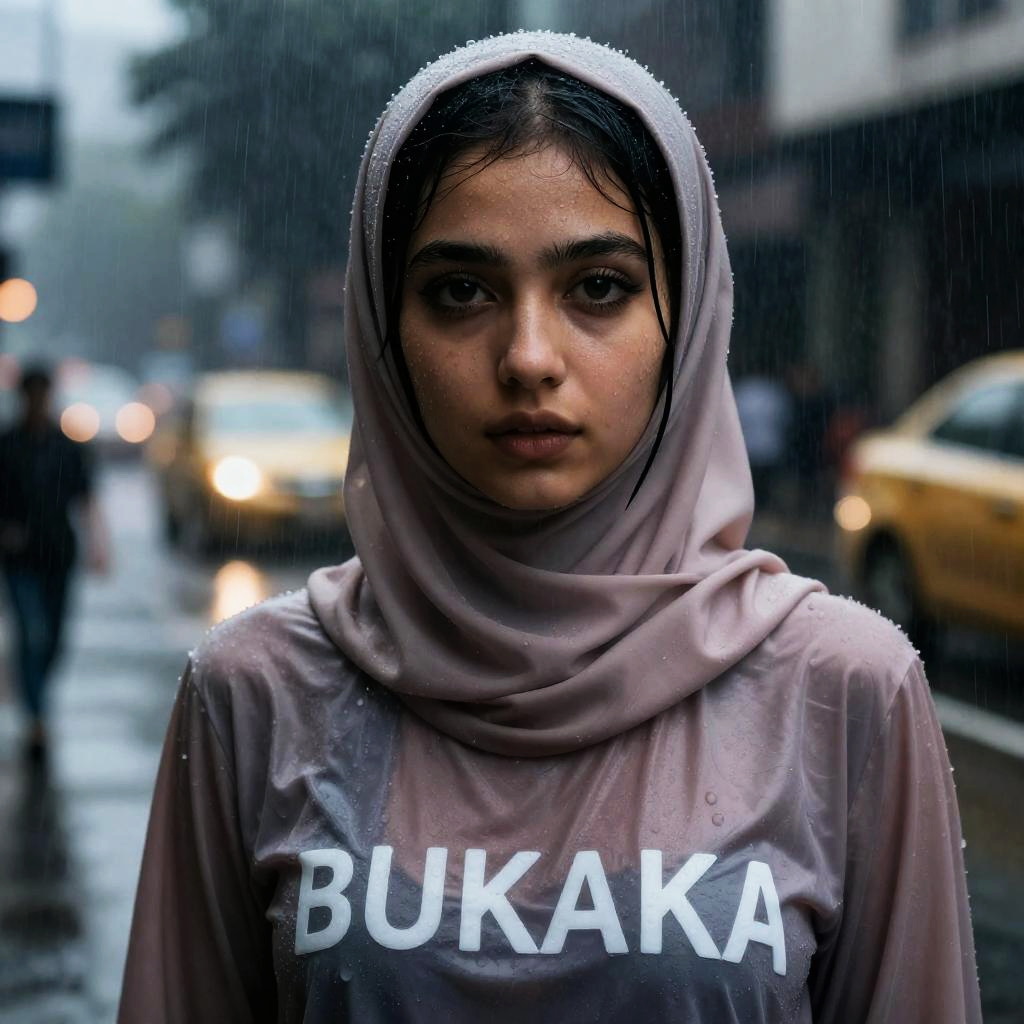 Realistic Woman in Wet Hijab Nightstorm
