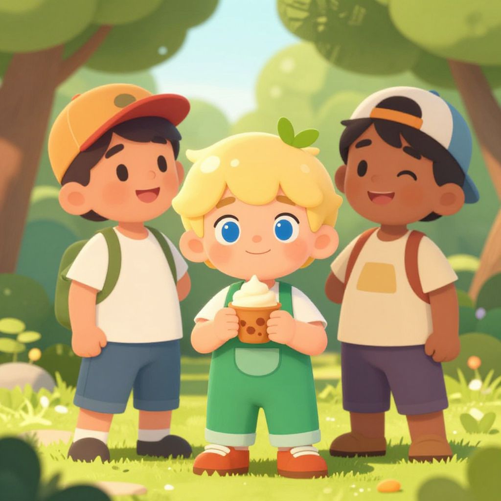 Cartoon child with blonde hair, blue jacket, and brown boots, holds flashlight in dark cave with autumn leaves on ground.