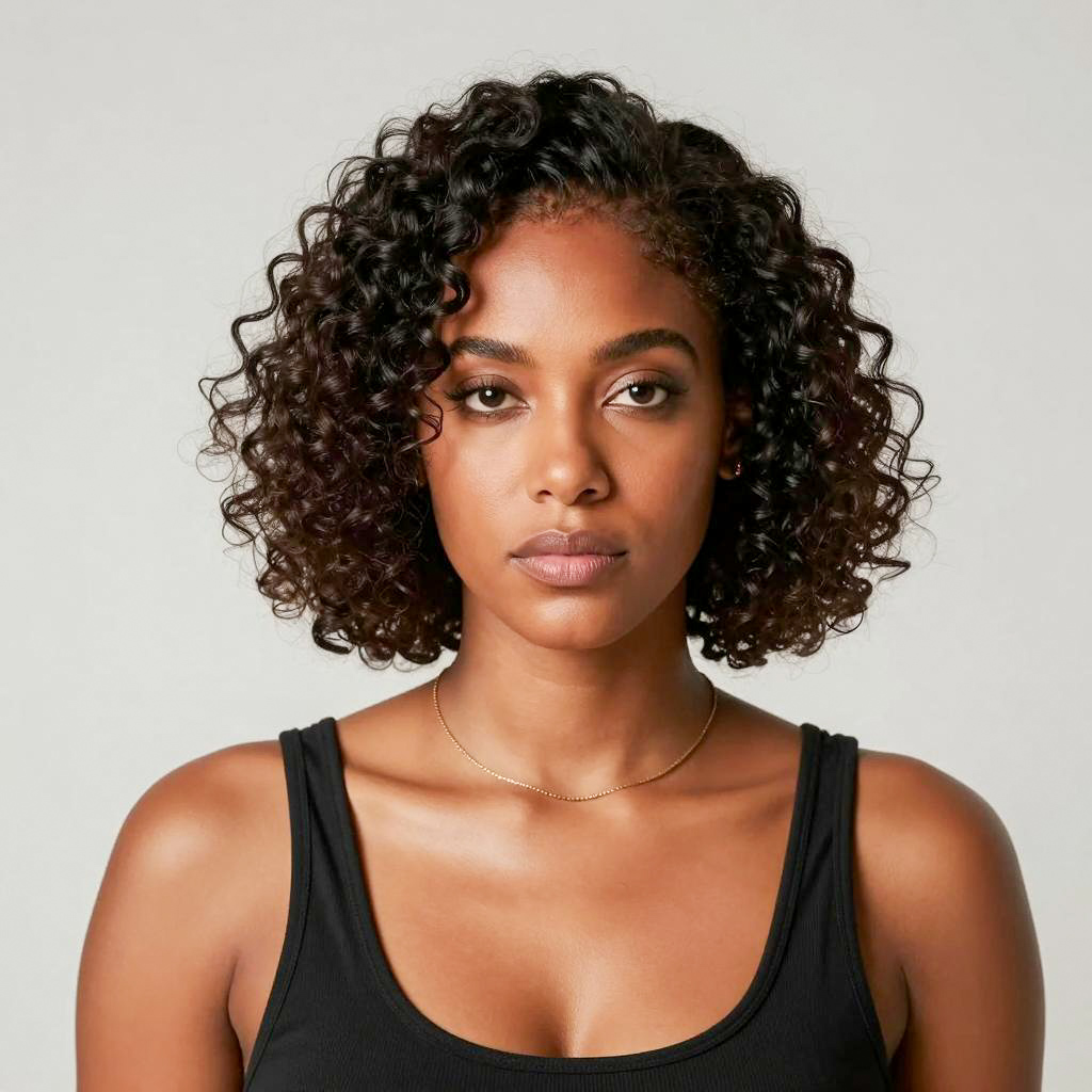 Pixie cut wig lace closure, photorealistic portrait of a beautiful Black woman with dark brown short bob hairstyle, wearing gold hoop earrings, gold layered necklace, black top, soft makeup, neutral background, front view, confident expression, even skin tone, professional studio lighting, close-up, high detail, realistic ure, elegant and poised, contemporary style