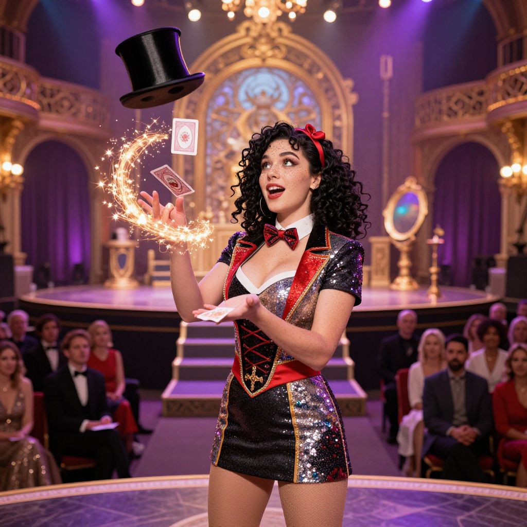 A lively, energetic young woman with curly black hair and freckles stands beside a magician on a grand, fully illuminated stage. She wears a fashionable, tailored assistant outfit with sparkling sequins and red accents. A glowing sparkle effect flows around her as she performs a complex illusion involving a disappearing card trick. The stage is packed with audience members in the background, and the lighting shifts from golden to purple during the performance. The keyword 'Magician assistant' is clearly visible in the scene, with her focused expression and interaction with props like a floating top hat and enchanted mirrors.. The woman has big tits and cute face
