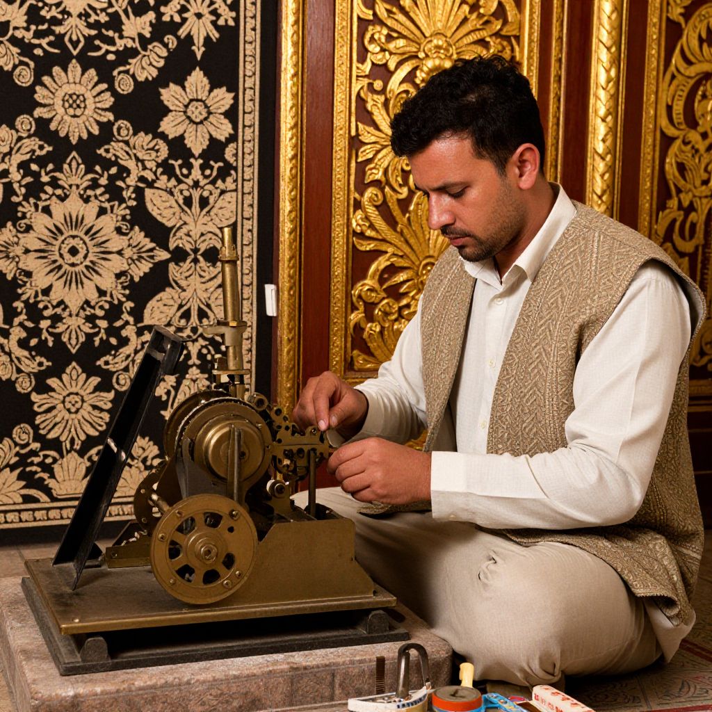 A man in traditional attire works on a mechanical device, surrounded by intricate patterns and ornate decorations.