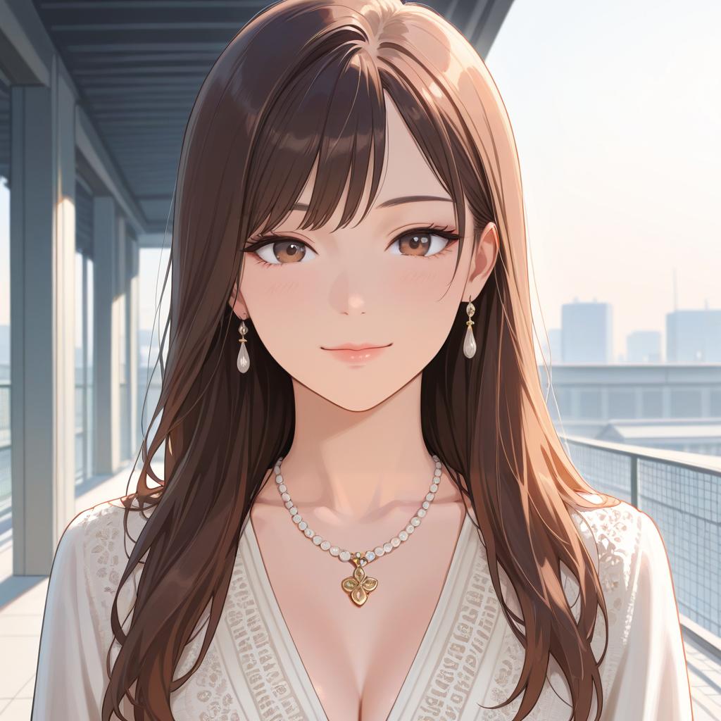 Realistic style, 1girl, solo, brown hair, long hair, looking at viewer, lips, jewelry, necklace, smile, focus on facial features, natural expression, smooth skin, soft gaze, elegant neck adornment, chic necklace design, radiant joy, sophisticated rooftop terrace, soft afternoon sunlight, beaded flapper attire