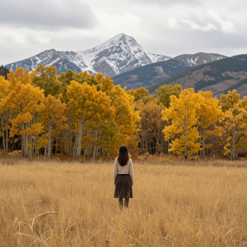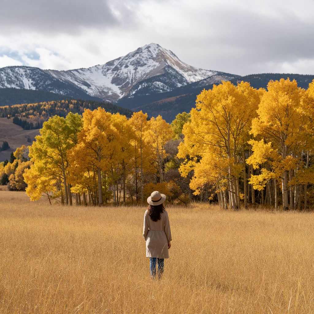 Woman standing in a golden meadow, gazing at vibrant aspen trees and distant snow-capped mountains under a cloudy sky, embodying the serene beauty of Colorado's fall landscape.