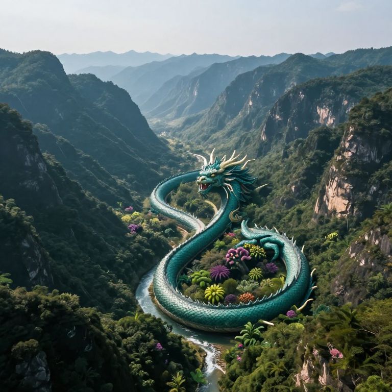 Mountains rise as enormous, sleeping dragons, their tails coiling into rivers and their scales forming valleys fertile with unearthly flora.
