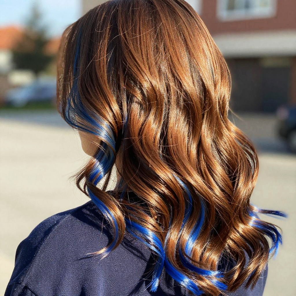Blue highlights with brown hair cascading in soft waves, under warm sunlight, with a subtle shine and natural texture, portrait style, detailed strands, vibrant blue tones contrasting rich chestnut brown, against a softly blurred outdoor background