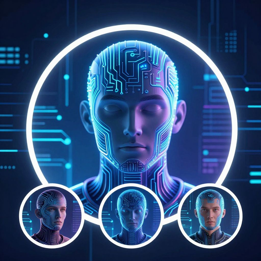 Digital art of a futuristic woman with a glowing, circuit-patterned face, surrounded by three smaller circular portraits, against a blue neon-lit background.