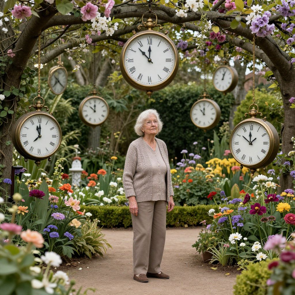 An elderly woman stands amidst a surreal garden where antique clocks dangle like flowers, their hands frozen in time, defying gravity and the passage of moments.