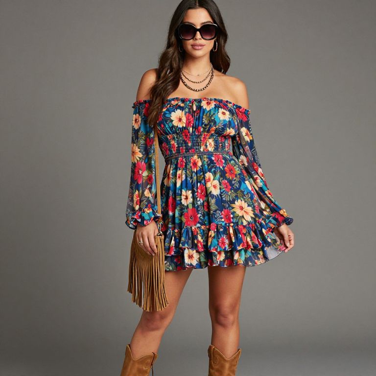 "Bohemian off-the-shoulder mini dress, lightweight chiffon material, vibrant floral print, ruffled hemline, cinched waist, complemented by tan ankle boots, fringed crossbody bag, layered beaded necklaces, oversized sunglasses.. Sexy. Pretty face and beаutiful eyes. Big breasts."