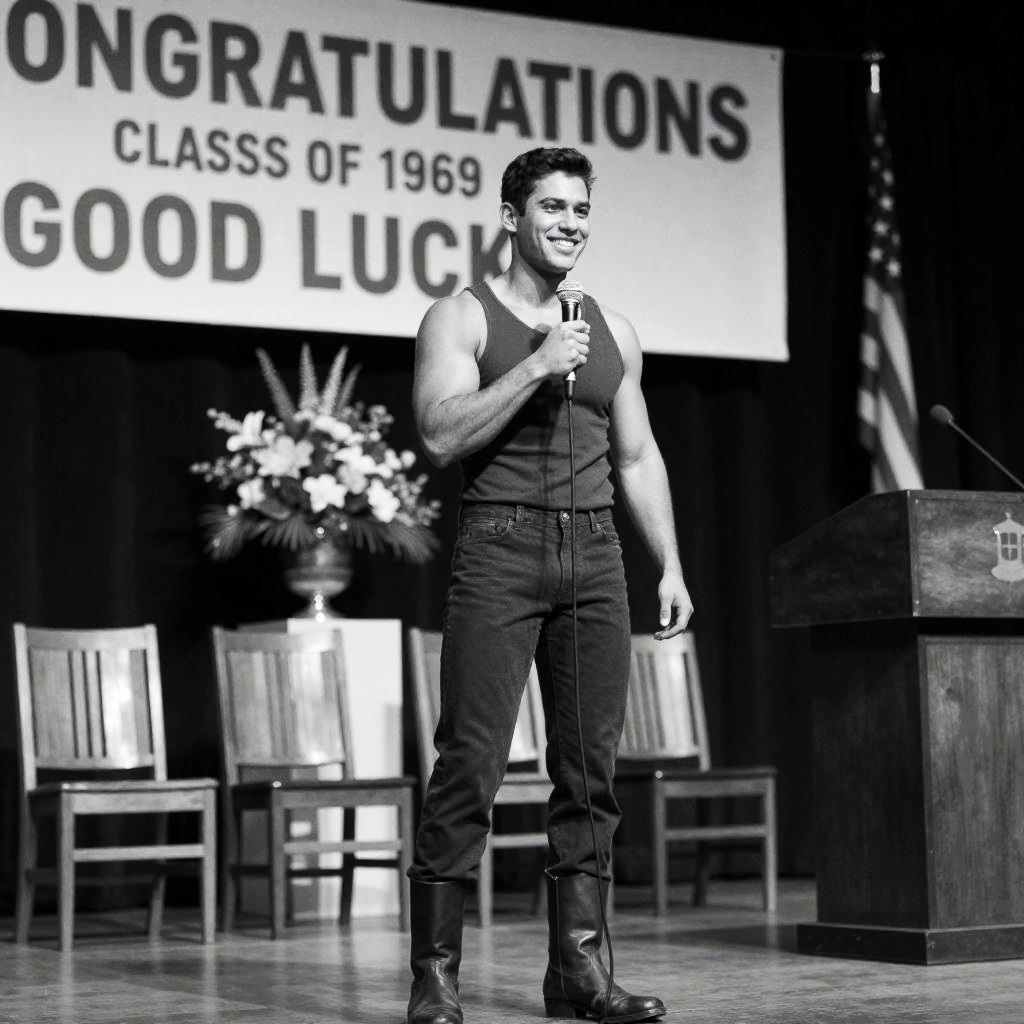 Black and white photograph of a muscular man in a singlet, holding a microphone, standing on stage. Background has a banner reading "CONGRATULATIONS CLASS OF 1969 GOOD LUCK," American flag, and floral arrangements. Man has short dark hair, smiling, with boots. Wooden chairs and a podium on stage.