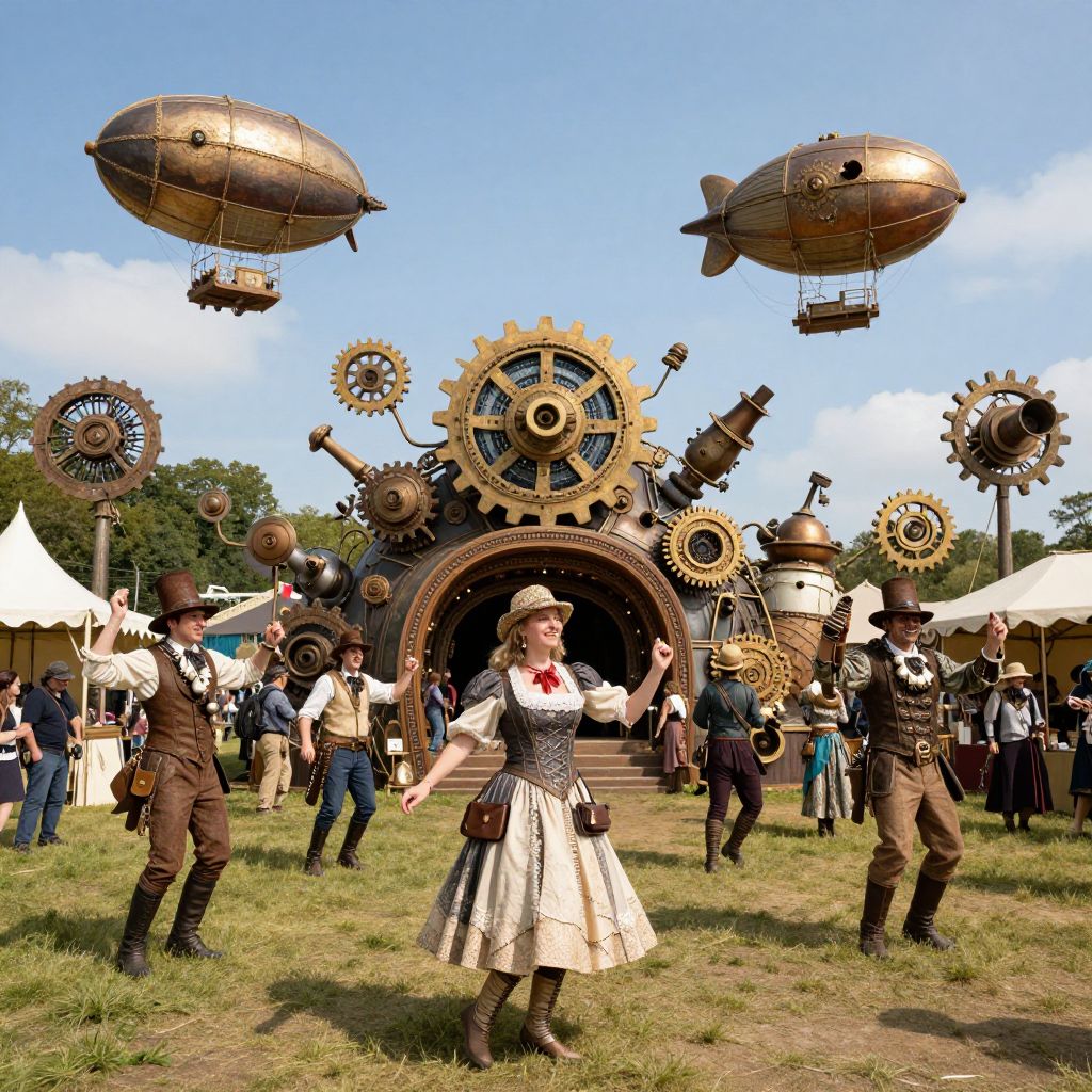 Steamhappy: a lively steampunk festival with airships floating in a bright blue sky, people dancing in mechanical costumes, festive steam-powered decorations, ornate gear motifs and a warm, animated vibe blending Victorian and futuristic elements