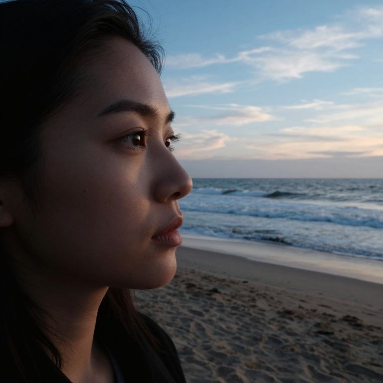 Craft a hyperrealistic portrait from an elevated angle, merging macro photography's intimacy with landscape painting's grandeur. Showcase a lone figure on a desolate beach at dawn, their silhouette contrasting against the horizon as they gaze towards the sea. Soft morning light illuminates their face, casting gentle shadows across high cheekbones and full lips, revealing life's subtle lines of experience. Their eyes are emotional depths reflecting the ocean's vastness and momentary serenity. The background seamlessly blends natural elements: rough sand beneath, rhythmic waves crashing ashore, and an endless sky with lazy wisps of clouds drifting across azure. This unique perspective evokes an emotional gradient that connects viewers to the subject's introspective solitude amidst nature's grandeur.