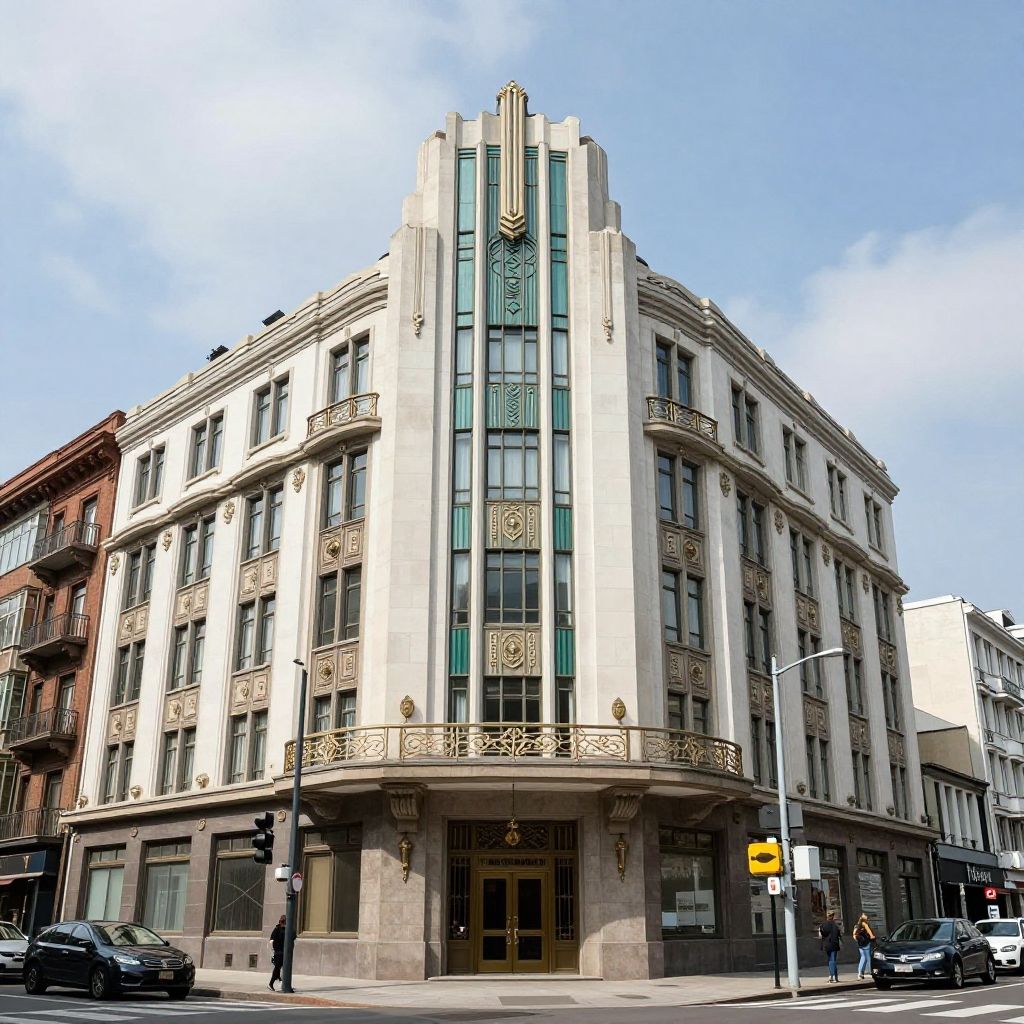 Photograph of a corner Art Deco building with ornate details, tall windows, and a central vertical accent, set against a clear blue sky.