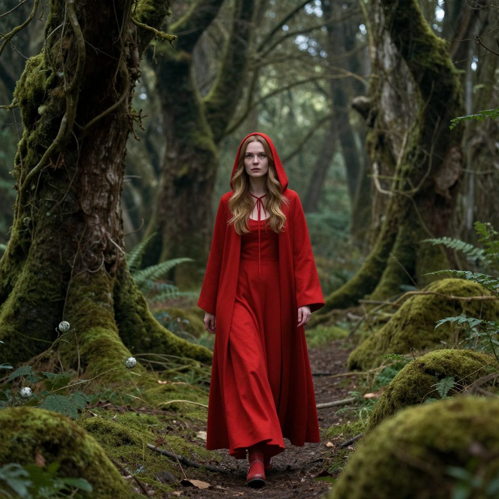 A woman in a red riding hood walks through a moss-covered, enchanted forest, with cinematic lighting and a fairy tale atmosphere reminiscent of \"Blade Runner 1982.\