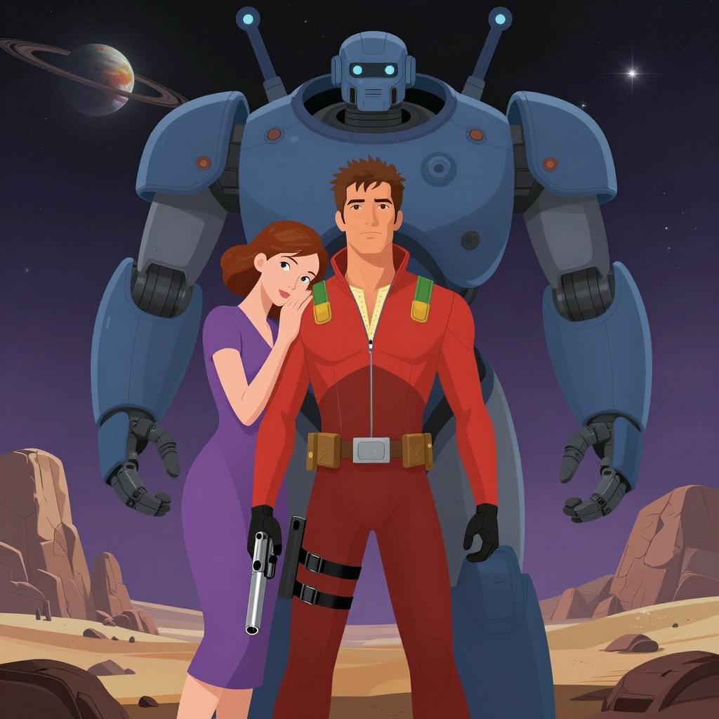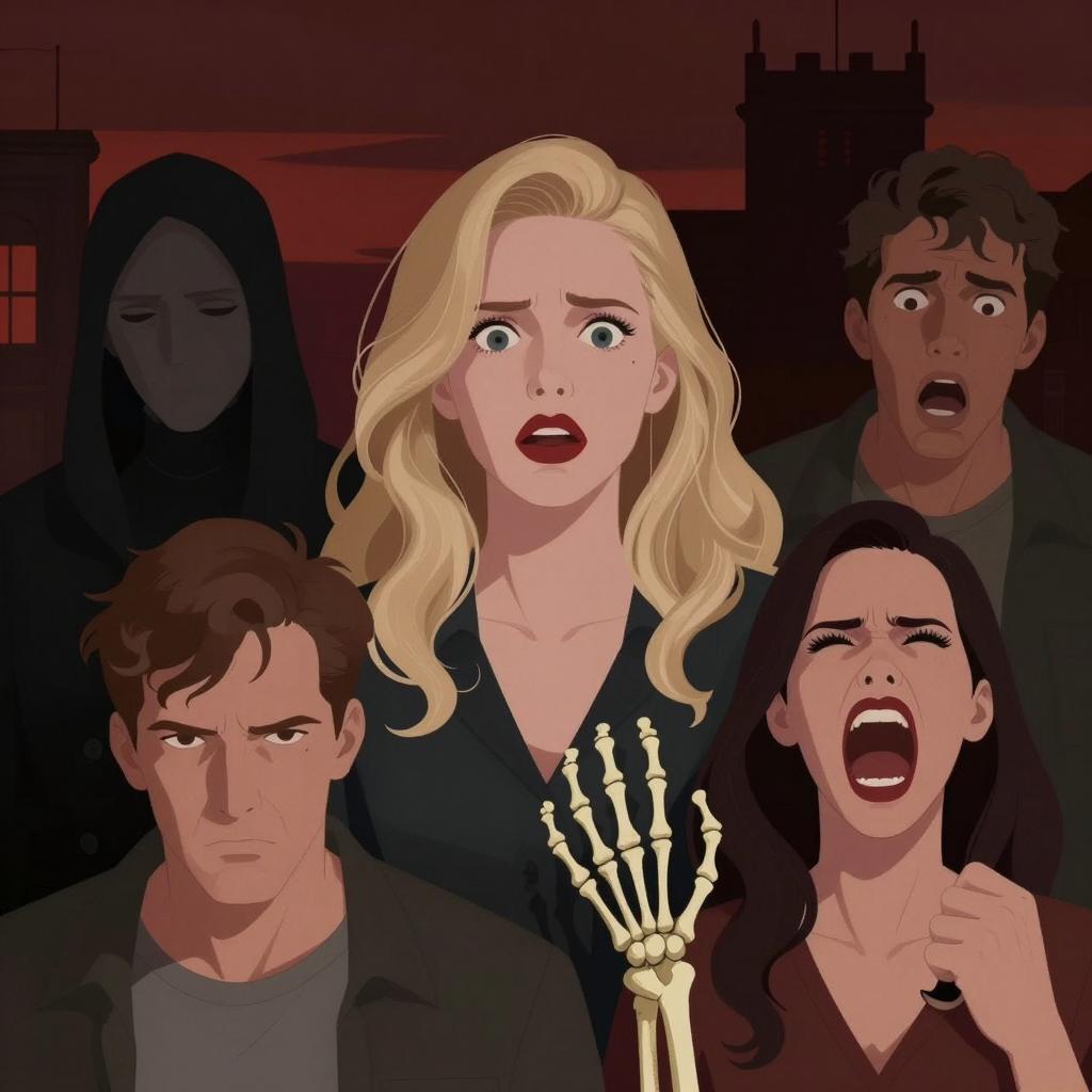 Digital illustration. Frontal close-up of a concerned, blonde-haired man in a gray shirt. Background: four people, intense expressions, dark red and yellow lighting, vintage car, black shadows with red waves. Man in foreground, others in background, standing.