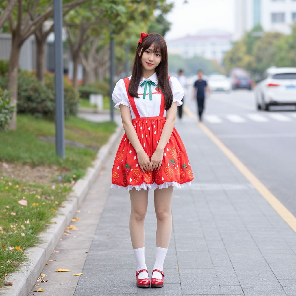 Woman in Strawberry Costume on Sidewalk
