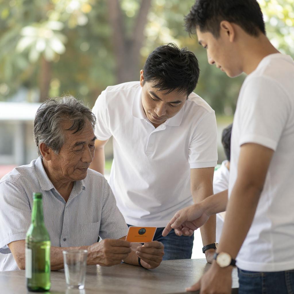 Photograph of four people outdoors. A middle-aged man with gray hair in a striped shirt sits at a table, holding an orange card. A man in a white shirt leans over, examining the card. Another person in white stands to the right, also looking at the card. A green bottle and glass are on the table. Sunlight filters through trees in the background.