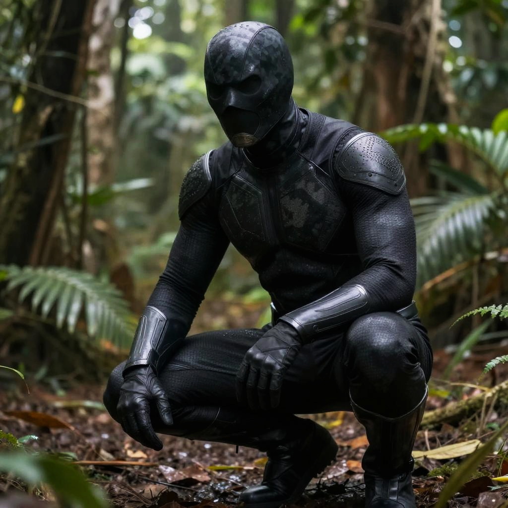 Black superhero suit, high-tech stealth outfit with adaptive camouflage pattern, crouched in dense jungle environment, soft natural lighting, hyper-realistic detail