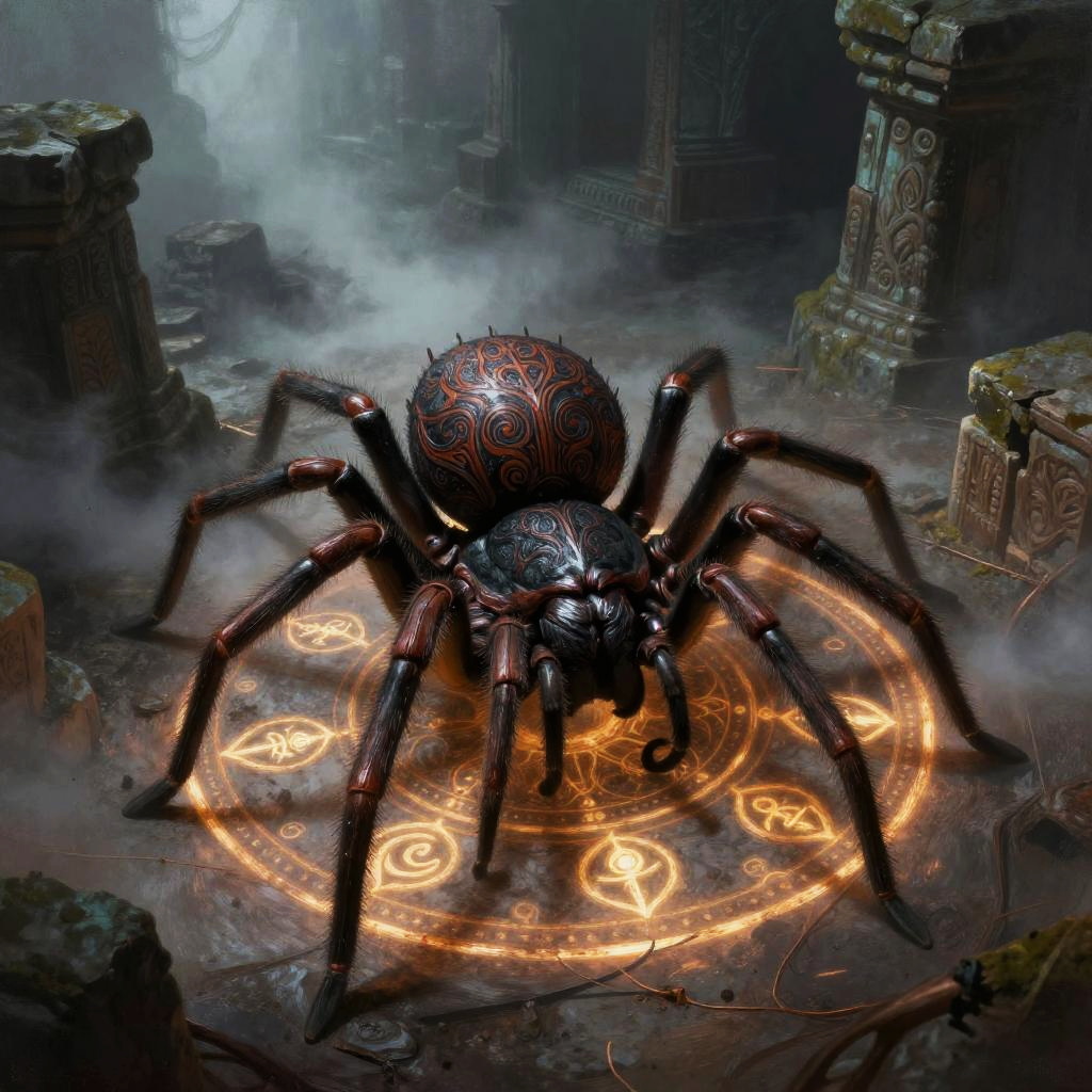 DND giant centipede emerging from ancient dungeon ruins, sharp mandibles poised to strike, scales shimmering with iridescent colors, surrounded by glowing runes and mystical fog, dramatic lighting emphasizing its monstrous size and texture